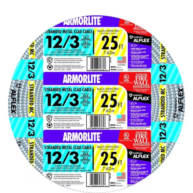 Southwire 69115401 Armorlite 250-Feet 12 / 3 Stranded Aluminum MC (Metal Clad) Cable