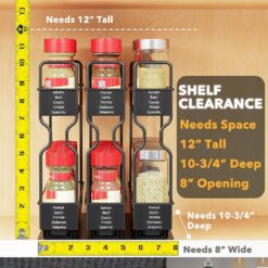 - EASY INSTALLATION – It is easy to install by removing the sliding base bottom. This rack needs 7.7″wide x 10.75″deep x 12″high cabinet space with standard spice jars on the upper tier.
