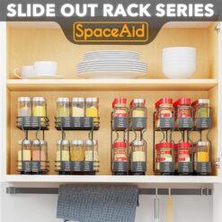- MORE SPICES IN LESS SPACE – Easy slide out spice rack organizer that holds a large number of spices in the small area. No more tip-overs of front items. This sliding spice rack gives your easy access to all seasonings stored in your cabinet. This is also a great cabinet organzier.