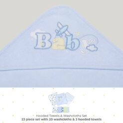 - WHAT’S INCLUDED | 23-Piece Baby Towel & Washcloth Set includes baby bath essentials: 20 Washcloths (9” x 9”) in assorted prints and 3 Hooded Baby Towels (30″ x 26″) embroidered or printed.