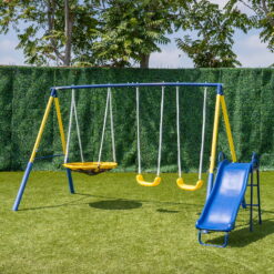The Super Saucer Metal Swing and Slide Set by Sportspower brings all the fun and exercise that kids need right into their own backyard! This swing set is built with high quality heavy-duty 2-inch steel tubes for a heavier and more durable swing set. As many as 5 kids can have fun together as they swing away on the two blow-molded swings, swing in the saucer, and slide down the 5ft 1pc blow molded slide. All swing chains are covered with safe and sturdy vinyl that protects kids’ hands while they play. Our heavy duty 5ft 1pc blow molded slide provides easy assembly unlike the hassles of assembling other competitor’s 3pc slides. Give your kids continuous active fun with the many activities this swing set has to offer! All Sportspower products meet or exceed all ASTM safety standards, so kids and parents can both enjoy the Super Saucer Metal Swing and Slide Set with a peace of mind.
