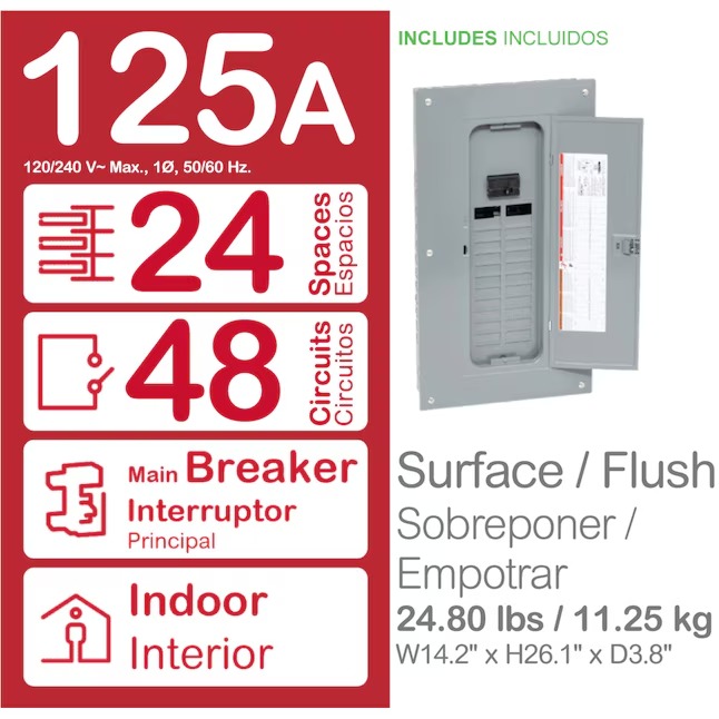 Square D HOM2448M125PC Homeline 125 -Amp 24 -Spaces 48 -Circuit Indoor Main breaker Plug-On Neutral Load Center