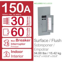Square D HOM3060M150PCVP Homeline 150 -Amp 30 -Spaces 60 -Circuit Indoor Main breaker Plug-On Neutral Load Center (Value Pack)