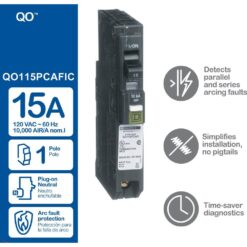 The Square D by Schneider Electric QO 15 Amp Single-Pole Plug-on Neutral Combination Arc-Fault Circuit Interrupting (CAFCI) Circuit Breaker is for use to help protect your wires from arcing faults and is intended for overload and short-circuits protection of your electrical system. Designed for reliability, the QO Plug-on Neutral CAFI Circuit Breaker connects directly to the neutral bar, providing a time and labor-saving installation. QO Plug-on Neutral provides several advantages and among them is fewer connections which lead to faster installation and an innovative neutral jaw eliminates pigtails which in turn frees gutter space. Now standard in all Square D brand CAFCI circuit breakers, Time-Saver Diagnostics provide advanced trip indication technology, helping identify the type of fault that has occurred faster. Time-Saver Diagnostics helps take away the guess work and provides diagnostic assistance by identifying the type of fault that last occurred. It saves money by reducing troubleshooting time, simple to use, accurate and reliable. Square D QO circuit breakers have features no other manufacturer can offer. These types of quality, industry exclusive products keep the Square D brand ahead of the competition and are builders’ and electrical contractors’ first choice in electrical protection.