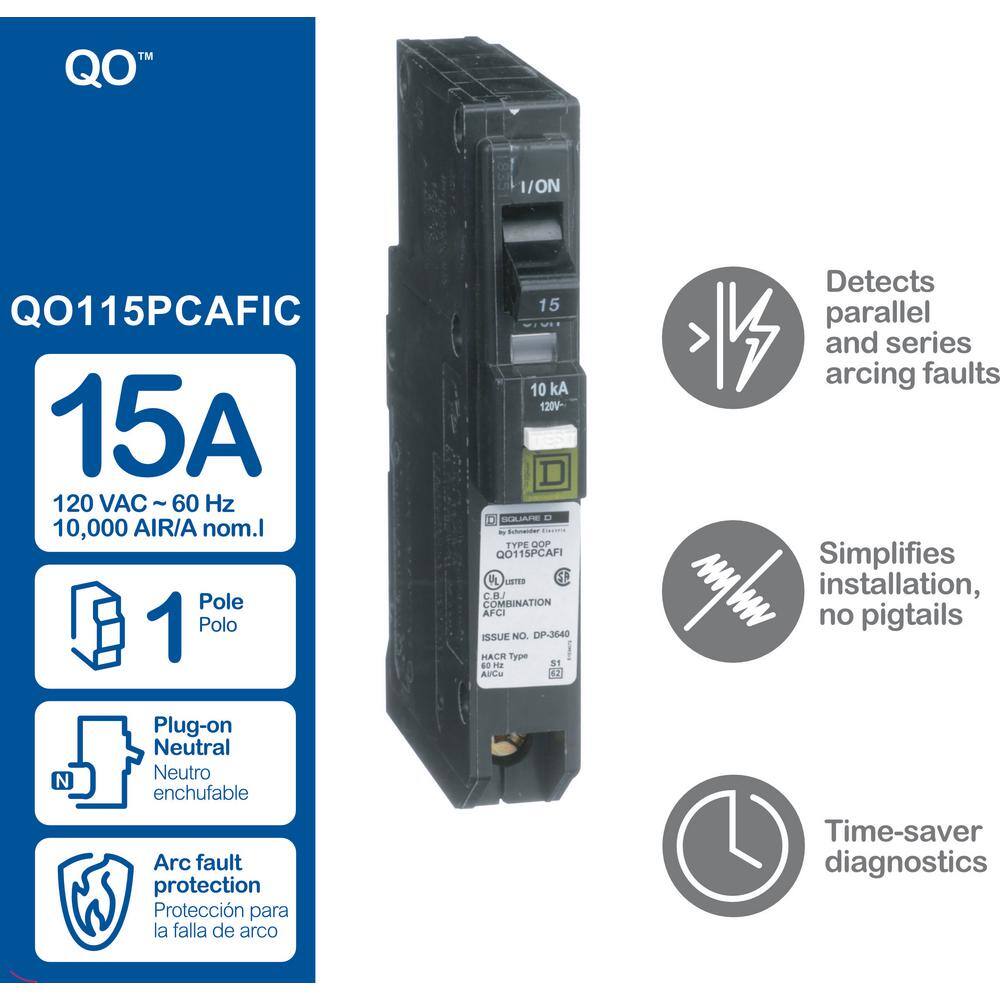 - Square D QO 15 Amp single-pole plug-on-neutral combination AFCI circuit breaker