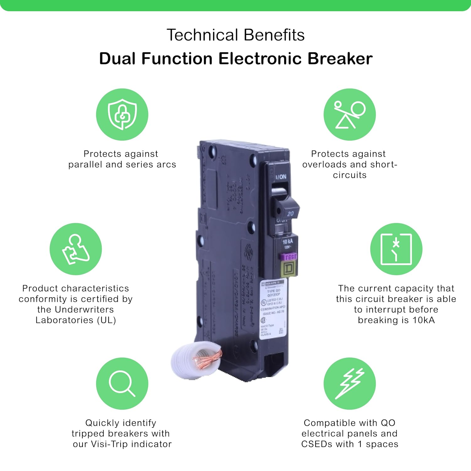 Square D by Schneider Electric QO 20 Amp 1-pole Dual Function Circuit Breakers is a space and labor saving device, engineered to meet prevailing NEC requirements. This device combine two critical technologies; Combination Arc Fault protection and Ground Fault protection (class A), in a single, easy-to-install device. The NEC now requires both Combination Arc Fault and Ground Fault protection on all 1-Pole, 15 Amp and 20 Amp kitchen and laundry circuits. Prior to the release of this new device, a contractor or homeowner’s only choice would have been to use a Combination Arc Fault circuit breaker in conjunction with an expensive, bulky Ground Fault receptacle. The new Dual Function circuit breakers help reduce cost and eliminate the hassle of using two separate devices to provide this essential protection. It’s a win for contractors and homeowners alike. Like all Square D CAFI Circuit Breakers, it is integrated with time saver Diagnostics, a unique feature that provides additional circuit information and minimizes troubleshooting at the touch of a button.