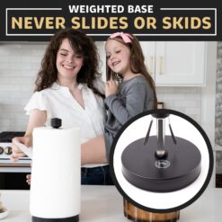 - Won’t Slide Around or Tip Over: Count on this weighted paper towel holder to stay put without wobbling or toppling; 4 powerful suction cups keep the weighted base firmly attached to any level surface, from a slick kitchen counter to a butcher-block workbench; Plus, rest assured this paper towel holder black won’t scratch your countertops or tabletops