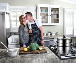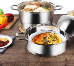 - [EASY ASSEMBLE & USE]: 5 pieces, including a large saucepan, 2 insert basket, a removable steam trays and a glass lid. Lid with a domed is brilliant for large steamed puddings avoiding pushing the steamer lid off. Visible cover allow you see how your food is doing while steaming. Top cover of Our 3 tier steamer is tall and roomy, and easy to remove or add parts depending on your needs. Dishwasher safe.