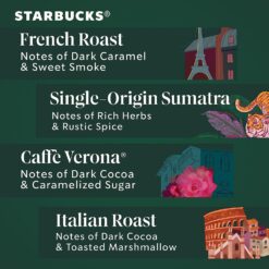 - STARBUCKS VARIETY PACK—The Starbucks dark roast coffee variety pack includes Starbucks French Roast coffee, Starbucks Italian Roast coffee, Starbucks Caffè Verona coffee and Starbucks Single-Origin Sumatra coffee