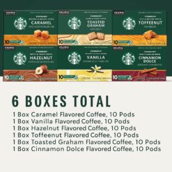 - FLAVORED COFFEES—This flavored coffee variety pack includes Starbucks Caramel Flavored Coffee, Starbucks Vanilla Flavored Coffee, Starbucks Hazelnut Flavored Coffee, Starbucks Toffeenut Flavored Coffee, Starbucks Toasted Graham Flavored Coffee and Starbucks Cinnamon Dolce Flavored Coffee