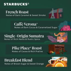 - STARBUCKS VARIETY PACK—The Starbucks Blonde, medium and dark roast coffee variety pack includes Starbucks French Roast coffee, Starbucks Caffè Verona coffee, Starbucks Single-Origin Sumatra coffee, Starbucks Pike Place Roast coffee, Starbucks Breakfast Blend coffee, Starbucks House Blend coffee, Starbucks Veranda Blend coffee, Starbucks Caramel Flavored Coffee, Starbucks Vanilla Flavored Coffee and Starbucks Cinnamon Dolce Flavored Coffee
