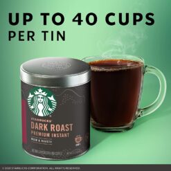 Try the smooth and delicious taste that’s stirring up instant coffee. Starbucks Premium Instant Coffee is what a cup of instant coffee should taste like. Starting your day off right is as easy as stirring our instant coffee into hot water and enjoying. Each tin of Starbucks Dark Roast Premium Instant Coffee makes up to 40 bold and roasty cups.