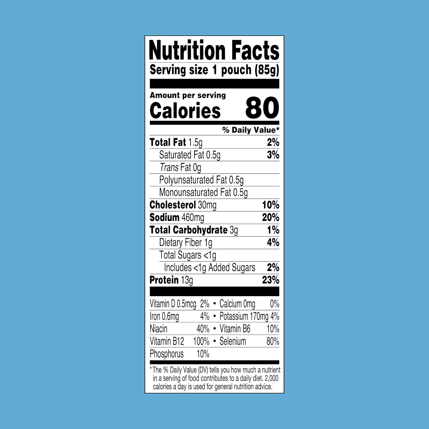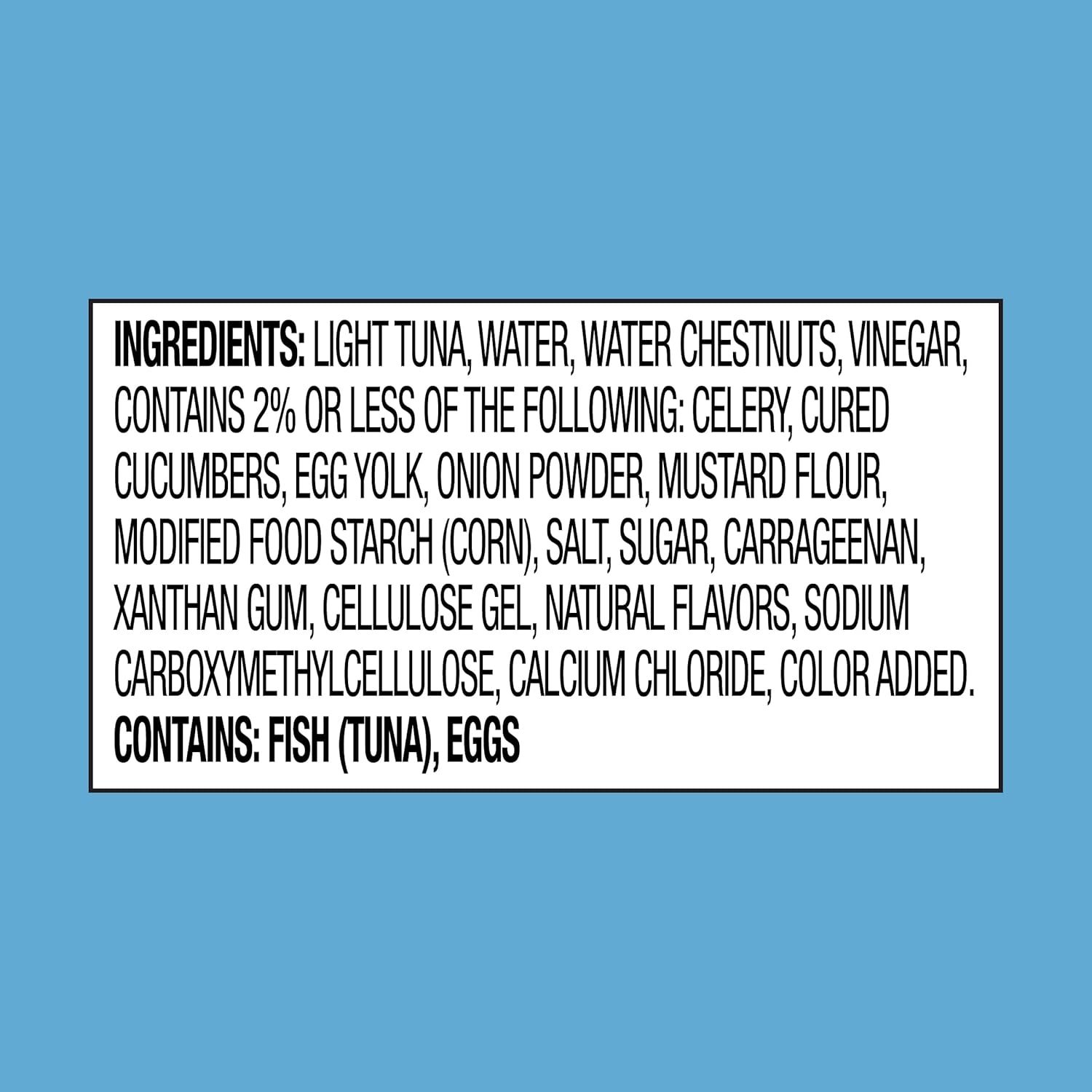 Light Tuna, Water, Water Chestnuts, Soybean Oil, Dill Pickle Relish (Cucumbers, Water, Vinegar, Salt, Natural Flavorings, Xanthan Gum, Potassium Sorbate, Sodium Benzoate, Calcium Chloride), contains 2% or less of the following: Celery, Egg Yolks, Vinegar, Sugar, Onion Powder, Mustard Flour, Salt, Xanthan Gum, Modified Food Starch (Corn), Dextrose, Guar Gum, Carrageenan, Cellulose Gel, Sodium Carboxymethylcellulose, Phosphoric Acid, Titanium Dioxide, Potassium Sorbate and Sodium Benzoate (as Preservatives), Natural and Artificial Flavors, Calcium Disodium EDTA