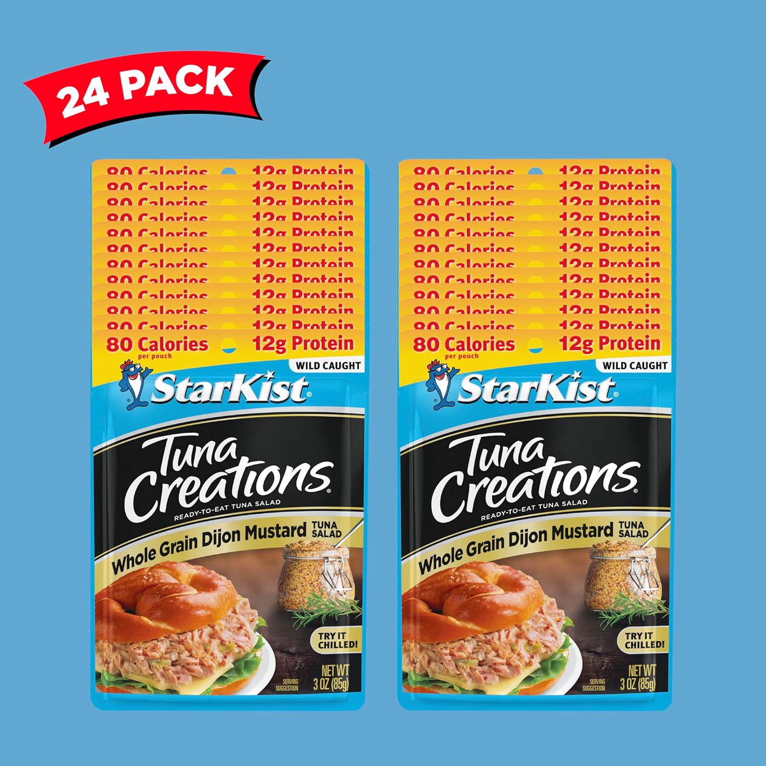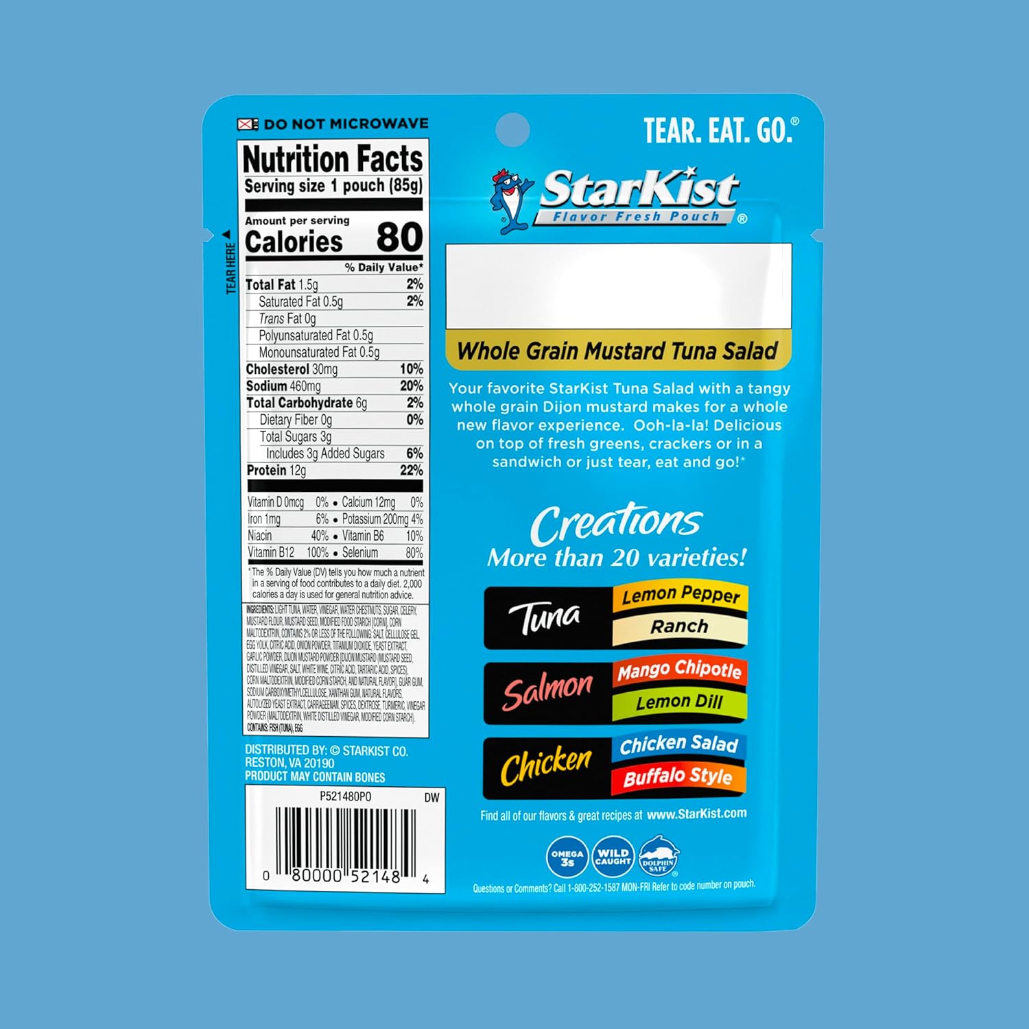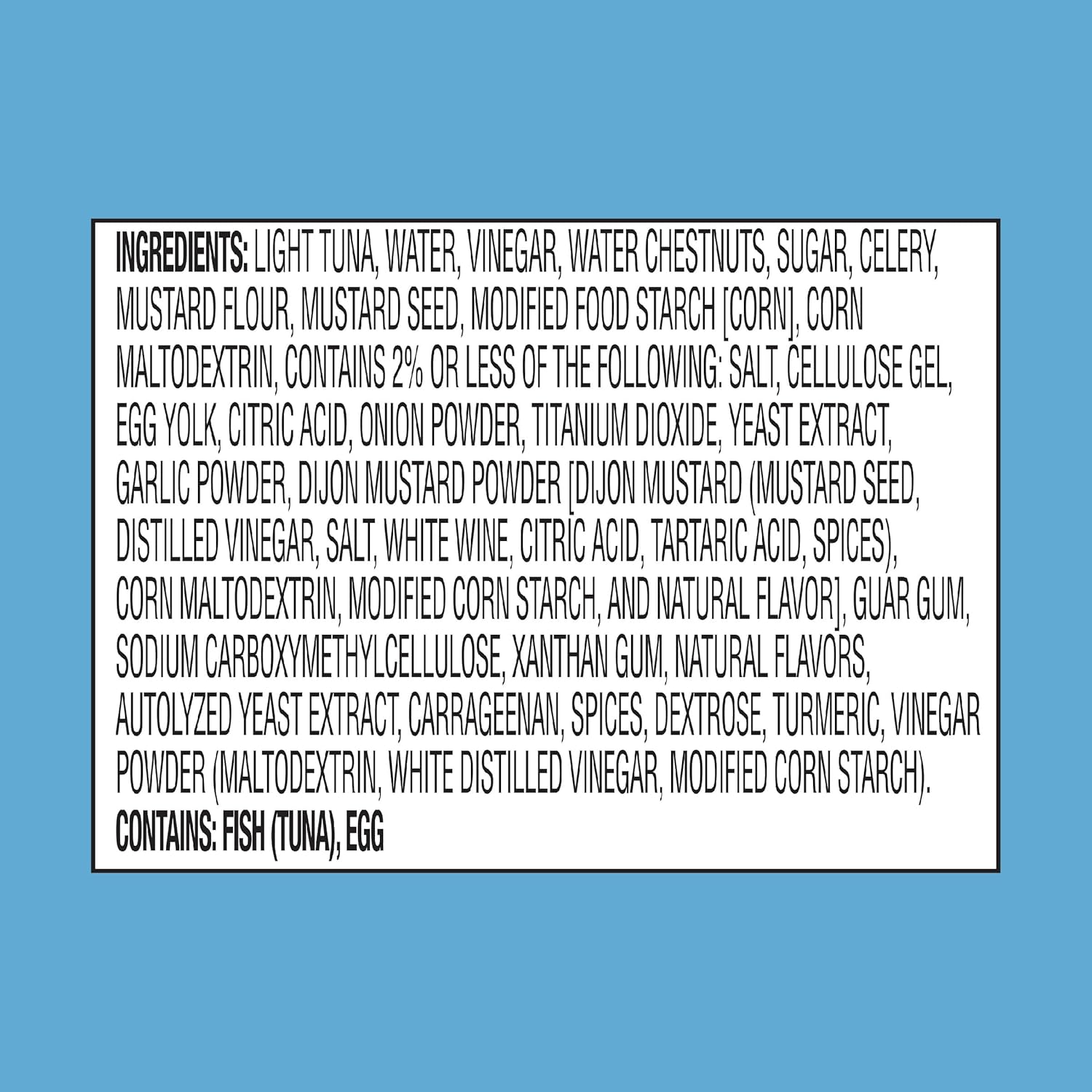 LIGHT TUNA, WATER, VINEGAR, WATER CHESTNUTS, SUGAR, CELERY. Contains 2% or less of the following: MUSTARD FLOUR, MUSTARD SEED, MODIFIED FOOD STARCH [CORN], CORN MALTODEXTRIN, SALT, CELLULOSE GEL, EGG YOLK, CITRIC ACID, ONION POWDER, TITANIUM DIOXIDE, YEAST EXTRACT, GARLIC POWDER, DIJON MUSTARD POWDER [DIJON MUSTARD (MUSTARD SEED, DISTILLED VINEGAR, SALT, WHITE WINE, CITRIC ACID, TARTARIC ACID, SPICES), CORN MALTODEXTRIN, MODIFIED CORN STARCH, AND NATURAL FLAVOR], GUAR GUM, SODIUM CARBOXYMETHYLCELLULOSE, XANTHAN GUM, NATURAL FLAVORS, AUTOLYZED YEAST EXTRACT, CARRAGEENAN, SPICES, DEXTROSE, TURMERIC, VINEGAR POWDER (MALTODEXTRIN, WHITE DISTILLED VINEGAR, MODIFIED CORN STARCH)
