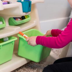 With Step2 Flip & Doodle Desk with Stool, an activity center developed to encourage their artistic discovery. The stool can comfortably support up to 75 pounds. It stands 11.75 inches tall. Flip the desk surface to experience the magic of a magnetic dry-erase board, revealing a world of possibilities for upright use and proudly displaying their artwork with the handy paper clip. This desk’s superb blend of functionality and aesthetic allows your children to easily keep organized. Molded-in trays store markers and pencils, while a cup holder keeps essentials close at hand. The comfortable stool increases the creative experience, allowing your children to be productive for extended periods of time. You’ll witness clutter change into organized brilliance with plenty of storage options, such as rear book storage, two large bins, and two smaller bins. The dimensions of 26″” H x 23.75″” W x 19″” D make this a small addition to your home. This art desk is made with long-lasting double-walled plastic that will hold up to years of use. You can be confident that the brilliant colors will not chip, fade, crack, or peel, allowing your child’s artistic experiences to flourish in a sturdy and vibrant universe.