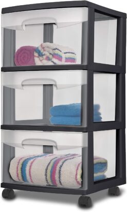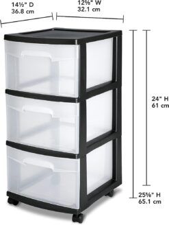 Sterilite 28309002 3 Drawer Cart, Black Frame with Clear Drawers and Black Casters