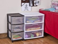 The 3 Drawer Cart offers a practical and versatile storage solution for any room of the home. Organize and store a variety of household items that are frequently used in the bedroom, kitchen / pantry, bathroom, craft room, nursery or dorm room. The clear drawers allow contents to be easily identified while keeping them contained. Keep clothing, towels, craft supplies, toys and more organized and neatly stored. The drawer stop feature prevents drawers from being removed accidentally. Use the included casters to create a rolling storage option, and easily move the Drawer Cart wherever it is needed.