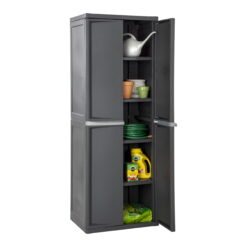 The Sterilite 4 Shelf Cabinet features doors that swing open easily, close securely and can accommodate a standard padlock. With four rugged adjustable shelves to optimize your storage space – ideal for organizing painting, gardening, car supplies, laundry essentials, sporting gear, and workshop items. Each shelf has a recommended weight limit of 40 pounds.