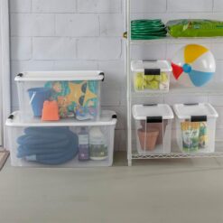 - Organize your home and keep clutter-free with the Sterilite 70-quart stackable storage containers with white lids and black hinged latch clips