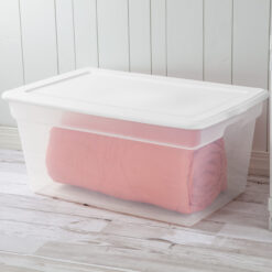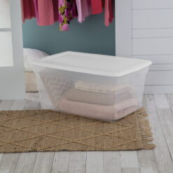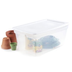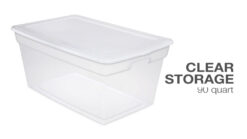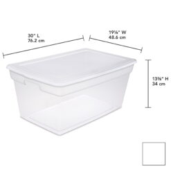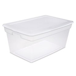 Get organized with the Sterilite Clear Storage Box line! The Sterilite 90 Quart Storage Box is ideal for a variety of basic and lightweight household storage needs, helping to keep your living spaces neat. The clear base allows contents to be easily identified at a glance, while the opaque lid snaps firmly onto the base to keep contents contained and secure.