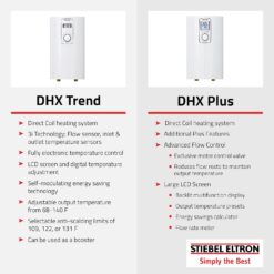 Stiebel Eltron DHX Trend electric tankless water heater switches on automatically as soon as a hot water valve at a tap or other draw-off point is opened. DHX heats water as it flows through the unit. When the tap is closed, the water heater switches off automatically. DHX Trend is electronically controlled tankless water heaters, and maintain a consistent outlet temperature. This is irre-spective of the inlet water temperature, up to the maximum output of the water heater. Certified to ANSI/UL Std. 499. Conforms to CAN/CSA Std. C22.2 No. 64. Tested and certified by WQA to NSF/ANSI 372 for lead free compliance. Dimensions: Height 14-1/8″ (360mm) x Width 8″ (202mm) x Depth 4-5/16″ (109mm).