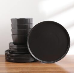 - 24-Piece Dinnerware Set – Stoneware is hip, cool and trendy. Especially in a fashionable black matte. These sets of dishes make a statement.