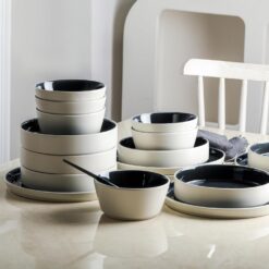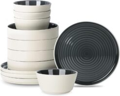 Stone Lain Elica 12-Piece Dinnerware Set Stoneware, Plates and Bowl Set, Black and Beige