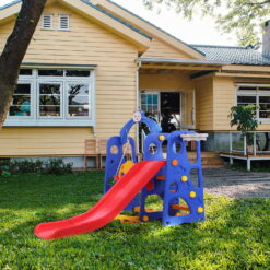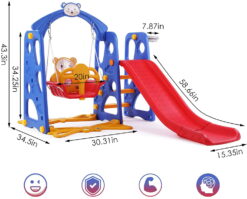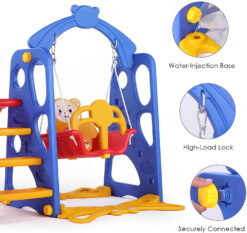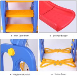 - – Toddler 4-in-1 playground set comes with smooth slide, non-slip climber, sturdy swing and basketball stand. The customized kiddie-size slide and swing set comes with a small ball, dedicated to providing more entertainment for kids.