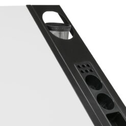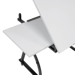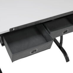 The Core Craft Table by Studio Designs combines many of our top features to create an attractive and functional work space. This hobby desk offers a durable metal side tray that attaches to the table top and has several storage compartments for your supplies. The 2 cloth drawers under the table top are 14” w x 18” deep for storing larger items. The angle adjustable top (36” Wide x 23.75” Deep) has a 24” pencil ledge to keep supplies from falling to the floor while tilted. A slide-out shelf extends from under the table top for more work space and stays flat while the top is angled. A metal mesh storage shelf between the legs (29” W x 5.25” D) provides even more storage for your stuff. You can customize the height of the desktop from 27.75” to 35” for added comfort. It is made with powder coated metal for durability. Two casters on the back legs make it easy to move.