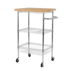 This Style Selections 3-tier utility kitchen cart is as tremendously useful as it is attractive. Constructed of strong steel with a durable shiny chrome finish, each shelf can support a weight capacity of 150-lbs. This cart is easily assembled with no tools, and each shelf can be effortlessly adjusted in 1-in increments to customize shelf levels based on your needs. Complete with 4 swivel casters, 2 are locking and 2 are non-locking, as well as a beautiful removable food-safe bamboo cutting board top. Cart measures 24-in W x 19.7-in D x 38-in H and includes a side handle for moving it to your desired location.