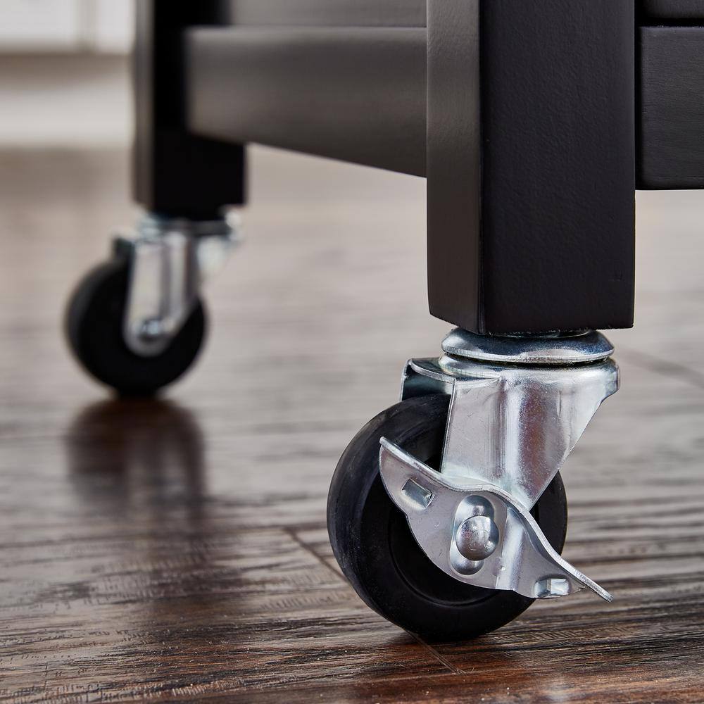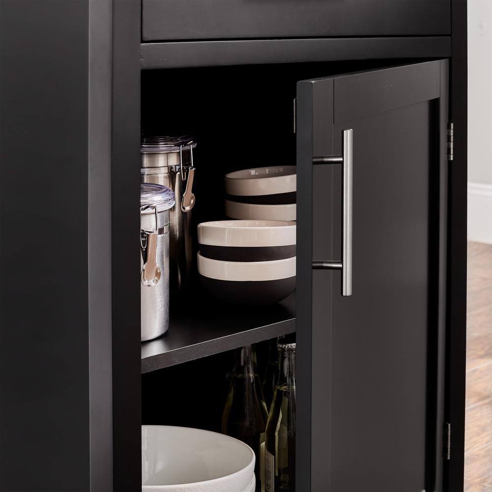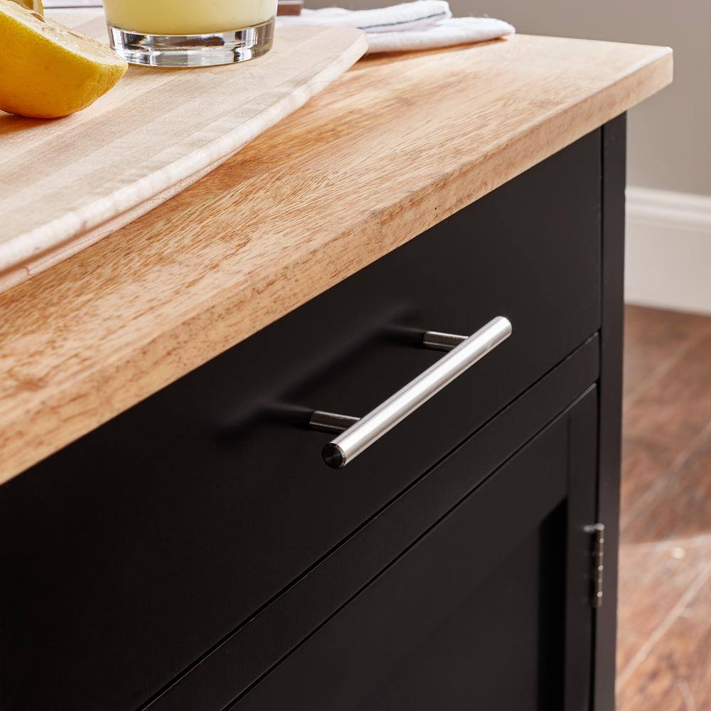 Make an update to your home with this StyleWell Glenville kitchen cart. Ideal for small spaces, it delivers more storage and counter space. The satin hardware, black satin finish and a butcher block top add decorative charm. You can place your dish towels on the towel bar and hooks. For easy portability, it comes with locking casters.