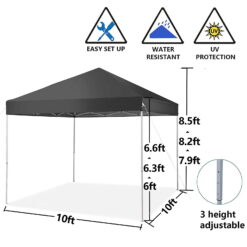 LARGER SHADE AREA: Straight leg design of the10x10 pop up canopy provides maximum coverage, so 6 or more people can enjoy 100 square feet of shaded space. Over 8.5’ maximum interior height, and over 6’ maximum clearance under the valance. Spacious enough for flea market, party, beach, business, sport events,community activity and any outdoor events.