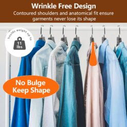- 【EXTRA WIDE HANGERS】: Preventing clothes from slipping, these clothes hangers feature an inward curved shoulder contour that mimics the natural arc of a human shoulder. This design keeps your suit free of creases, preserving its original shape. The wide shoulder hangers not only offer ample support and even weight distribution for your suit but also maintain the collar and drape impeccably.