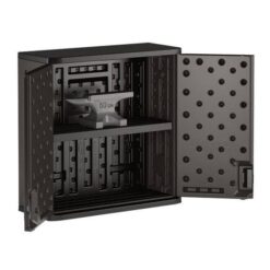 The Suncast Commercial wall storage cabinet is made using state of the art blow molding technology that produces greater strength and durability. The cabinet’s heavy duty construction resists scratches, dents and rust. The shelf can hold up to 50 lbs. and will resist bending under the weight. This is quick and easy to assemble and requires minimal tools. This cabinet is the perfect storage solution for any situation.