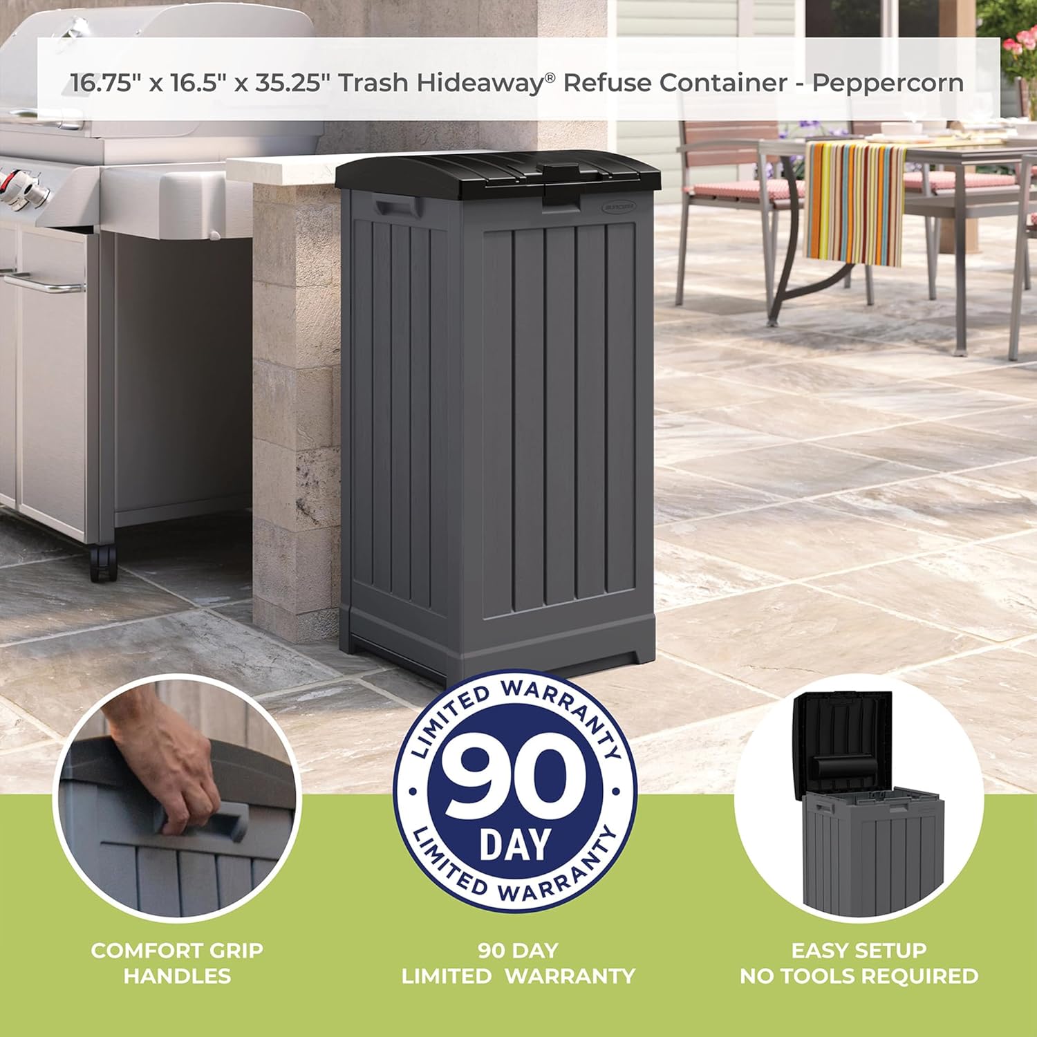 Suncast Trash Hideaway 39 Gallon Outdoor Trash Can Patio or Deck Waste Bin with Latching Lid, Liquid Tray, Handles, and Trash Bag Holder, Peppercorn