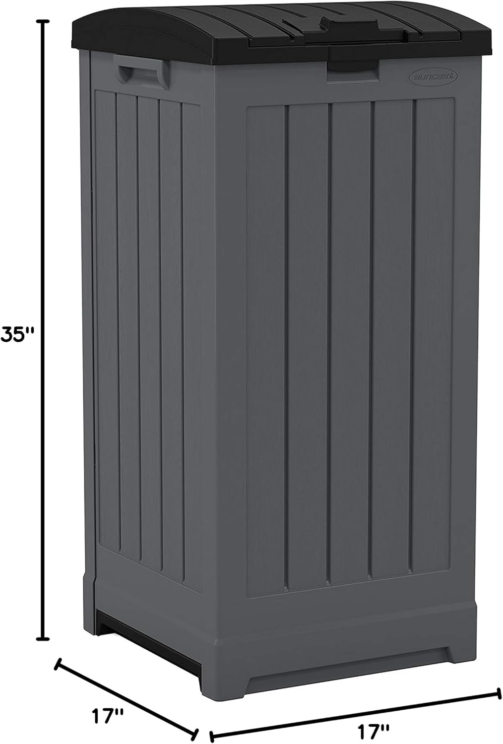 Keep unsightly garbage out of view with the Suncast 39-Gallon Resin Outdoor Hideaway Patio Trash Can. This patio trash can features a decorative yet functional gray and black modern design for a stylish addition to your outdoor space. The decorative and functional waste bin is compatible with standard 36-39 gallon garbage bags and utilizes a trash bag roll holder for quick bag refresh access. This trash can also features a secure double latching design to help keep trash in and critters out, as well as a pullout liquid catch tray for easy cleaning. Constructed from durable all-weather resin that resists fading, this trash can is built to provide long-lasting use. Plus, the comfort grip handles offer easy mobility. The Suncast 39-Gallon Resin Outdoor Hideaway Patio Trash Can measures 17″” x 17″” x 35″” to keep your yard clean without taking up too much space. Suncast takes pride in helping customers enhance their indoor and outdoor spaces with quality products that are stylishly designed. You take pride in creating a beautiful environment. We take pride in keeping it that way.