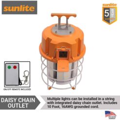 Highlighting a dedication to quality and integrity, the Sunlite product line includes compact fluorescent, linear fluorescent, incandescent, HID, metal halide, halogen, decorative, miniature, specialty, stage-studio lamps, and LED lamps. The Sunlite line also includes a full array of indoor and outdoor household fixtures, commercial fixtures, and electrical products including extension cords, socket adapters, wall plates, receptacles and switches, dimmers and timers, surge protectors, and much more. This round corn cob shape LED portable work light fixture is made of aluminum and polycarbonate and is extra bright with 12,500 Lumens output.