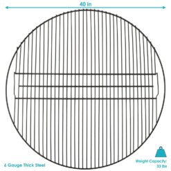 - Large size; round grate has a 40 in. Dia, 7-Gauge thick steel; weights 18 lbs. (33 lbs. weight capacity)