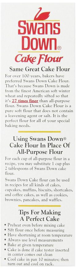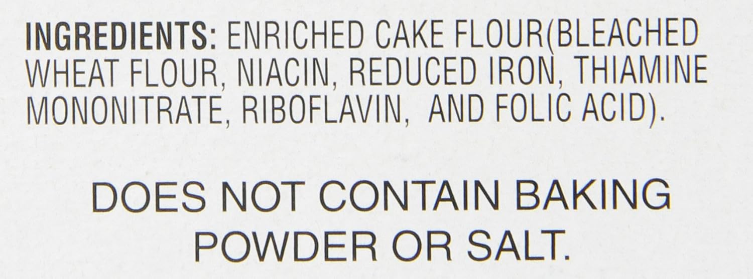 Enriched Cake Flour (Bleached Wheat Flour, Niacin, Reduced Iron, Thiamine Mononitrate, Riboflavin, and Folic Acid). Does not contain baking powder or salt.