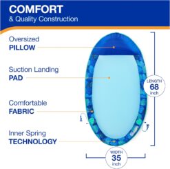 Float through summer with the SwimWays Spring Float Elite Hammock Float, featuring a soft cooling mesh that keeps your body just below the water’s surface to keep you comfortably cool for hours of relaxation and fun on hot summer days. With an all-new innovative linking feature, easily connect to your friends’ pool floats for company, or connect to a pool wall or boat to stay in one place! To connect to friends, attach the bungee cord to the landing pad on your friends float, or to the end of another cord! Floating on your own? Suction to a smooth and wet surface, pool walls are perfect! The oversized inflatable pillow supports your head and neck so you can keep your head and hair mostly dry while the cares of everyday life drift away. Meanwhile, a patented inner spring around the outside edge of the float provides greater comfort and stability in the water to keep you afloat. Our patent pending Hyper-Flate Valve minimizes direct contact while maximizing airflow, allowing for easy inflation in a fraction of the time. The anti-stick fabric construction makes the Spring Floats a pleasure to float in and must-have swimming pool accessories for the summer! This pool float folds down flat into three compact circles, making it perfect for travel. The SwimWays Spring Float Essential Pool Hammock measures 68 in x 35 in x 6 in when fully inflated and supports most adults up to 250 lbs.