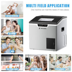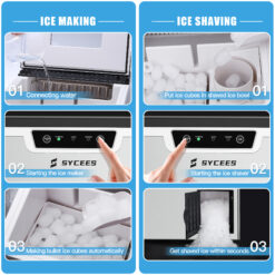 Tips: The ice machine should stand upright with the lid open for at least 2 hours before first use. Why Choose Sycees 2-in-1 Ice Machine Unique 2-In-1 Ice Machine: This is the first and the only multi-functional ice machine that offers you the availability of making ice cubes and shaving ice at the same time. Unique design ice maker & shaver beats all other ice machines out there and is energy, time, and space-saving. (Other ice machines can only produce 7-9 ice cubes per cycle. Produce Thicker Ice Cubes: Featuring modern R290 refrigerant technology and a powerful yet quiet compressor, the ice maker could produce thicker than similar products. What’s more, Integrated Insulation Technology keeps the good ice insulated and melts more slowly. (Ice Cubes are thicker and bigger than other bullet ice makers. Fast Speed Ice Shaver: Simply put ice cubes in the and press the button to start the ice shaver. The high-Speed motor can produce shaved ice within seconds per cycle to meet the demands of crushed ice serving in a relatively short time. Is designed just right to collect crushed ice from the door-type shaved ice outlet. Easy to Operate and Control: The intuitive control panel allows you to make ice or shave ice with ease, and with a large see-through window so you can easily monitor ice levels. Different indicators Lights will remind you when to add water, whether is normal and if the ice reaches the ice-full sensor. Compact and Portable Ice Machine: The compact size and 2 convenient handles make the ice maker portable enough to fit on your kitchen countertop or carry with you to the party. You will enjoy more frosty fun at the party, home, bar, and so on, if only owned this flexible ice-making and shaving machine. Two Different Ways Water Filling:1, Manually pour water into the. 2, Automatic filling by easily connecting to a water tap with provided accessories. Fill water any way you want, it’s so easy. (Note: When adding water, pay attention not to exceed the max water filling line.
