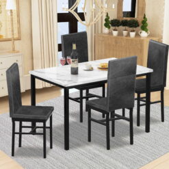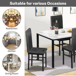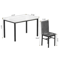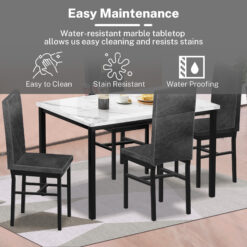 This dining table set is ideal for you to spend a happy dining time with your family. The table with a faux marble countertop can add a touch of elegance and sophistication to your home. The dining chairs are decorated with soft cushions and durable velvet fabric, which would bring you an extra comfortable experience. Waterproof marble tabletop surface can be cleaned most easily when sprinkling or drinking water. And the legs are constructed with solid metal, offering durability that you can enjoy for several years. This dining table and chairs set is perfect for your kitchen, dining room, living room, and some small places.