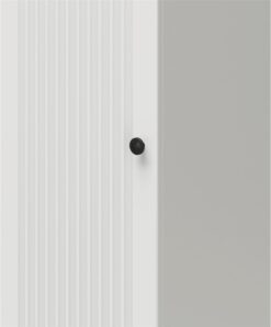 - Featuring five spacious shelves, two fixed and three adjustable; elegant fluted vinyl door & black metal hardware