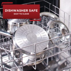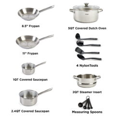 Includes 8.5″ frypan, 11″ frypan, 1qt covered saucepan, 2qt covered saucepan, 5qt covered Dutch oven, 4 Nylon tools, and 2qt steamer insert. Even heat Induction base ensures no hot spots. Dishwasher and oven safe up to 500°F.