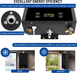 - 【Quality Material】-This of ours Water Heater Crafted from stainless steel, our Propane water heater exhibits high temperature resistance and corrosion resistance. It also features a built-in oxygen-free copper water tank, reduce heat loss ensuring a prolonged service life.with with LED smartdigital display effortlessly adjust the temperature between 86°F-167°F according to your preferences.