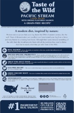 - Taste of the Wild Pacific Stream with SMOKE-FLAVORED SALMON dry dog food; REAL FISH is the #1 ingredient; high-protein (32%) to help support bones, joints and LEAN, STRONG MUSCLES