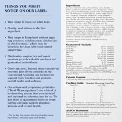 Salmon, ocean fish meal, sweet potatoes, peas, pea flour, lentils, canola oil (preserved with mixed tocopherols), salmon meal, smoke-flavored salmon, natural flavor, tomato pomace, salt, DL-Methionine, choline chloride, taurine, dried chicory root, tomatoes, blueberries, raspberries, yucca schidigera extract, dried Lactobacillus plantarum fermentation product, dried Bacillus subtilis fermentation product, dried Lactobacillus acidophilus fermentation product, dried Enterococcus faecium fermentation product, dried Bifidobacterium animalis fermentation product, vitamin E supplement, iron proteinate, zinc proteinate, copper proteinate, ferrous sulfate, zinc sulfate, manganese sulfate, copper sulfate, potassium iodide, thiamine mononitrate, manganese proteinate, ascorbic acid, vitamin A supplement, biotin, niacin, calcium pantothenate, sodium selenite, pyridoxine hydrochloride, vitamin B12 supplement, riboflavin, vitamin D3 supplement, folic acid. Contains a source of live (viable), naturally occurring microorganisms.