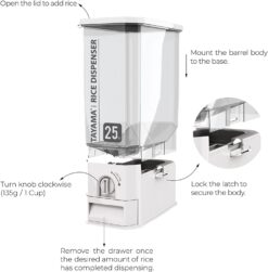 Tayama® Rice Dispenser is made from PP and ABS materials and is BPA Free. The slim and modern design allows you to keep the rice or other grains safe from insects, pests, mold and other contaminants. With a simple knob-turn, the process of storing and dispensing rice is made more convenient. The rice automatically dispenses out with a volume of 135g (1 cup) each time with ease, by simply the turn of the knob.