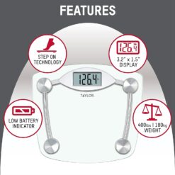 Keep track of your weight at home with this Taylor glass and chrome digital Scale. This chrome and glass scale features a high-tempered glass platform, and a high-quality chrome finish base. Featuring an instant on, auto zero, auto off, and low battery indicator, this scale is easy to use and requires no programming. A 1. 2-Inch digital LCD readout makes it easy to read. A 400-Pound (180 kilogram) capacity ensures almost everyone can keep track of his or her weight in the bathroom. The required AAA batteries come included.