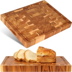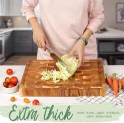 - EXTRA LARGE AND THICK FOR ALL CUTTING NEEDS: The cutting board measures 17x13x1.5 inches. It is big, thick, sturdy with End Grain Wood. Could be used as cutting, chopping, carving board, heavy duty butcher block or serving tray. With proper care, this cutting board will outlast most items in your kitchen.